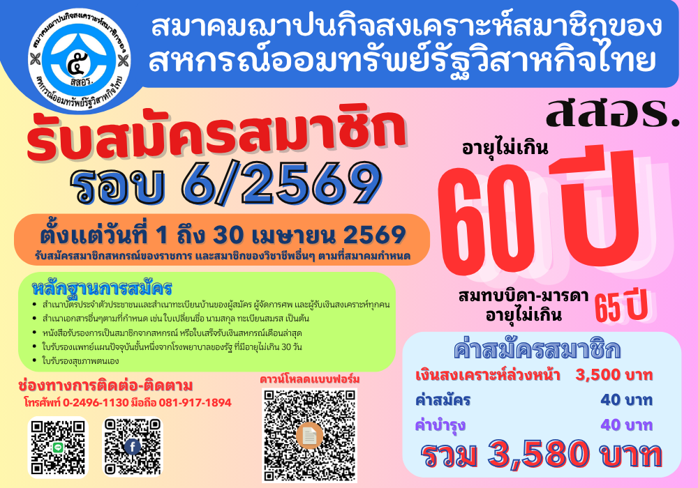 - ประกาศ หลักเกณฑ์การรับสมัครสมาชิกสมาคมฌาปนกิจสงเคราะห์สมาชิกของสหกรณ์ออมทรัพย์ไทย รอบที่ 1/2569-12/2569 (12 รอบ)